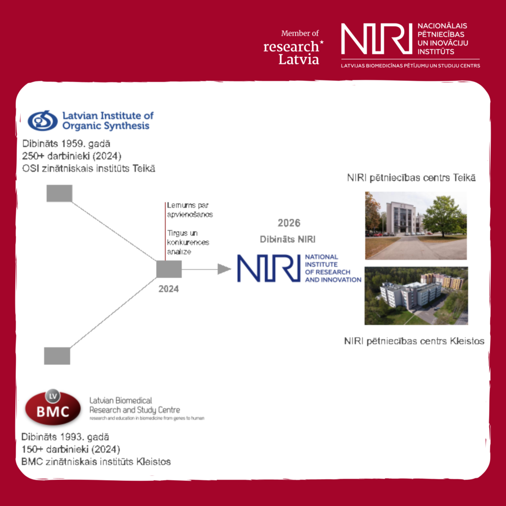Apvienošanās process norit jau no 2024. gada, un tas tiek īstenots ar ANM projekta Nr. 5.2.1.1.i.0/2/24/I/CFLA/001 “Latvijas Organiskās sintēzes institūta un Latvijas Biomedicīnas pētījumu un studiju centra konsolidācija” atbalstu, kura ietvaros paredzēta pakāpeniska OSI un BMC darbību un procesu harmonizāciju, kā arī cilvēkresursu apvienošana, lai līdz 2026. gada 31. maijam izveidotu NIRI. Konsolidācijas gaitā plānots veikt strukturālās pārmaiņas, lai paaugstinātu augstākās izglītības un zinātnes kvalitāti, palielinātu resursu ieguldījumu efektivitāti un koplietošanu, un veicinātu starptautisko zinātnisko konkurētspēju, apvienojot OSI un BMC. 2025. gada 14. oktobrī Ministru kabinets pieņēma vēsturisku lēmumu, apstiprinot Nacionālā pētniecības un inovāciju institūta (NIRI) izveidošanu. Esam konsolidācijas aktīvākajā posmā, jo notiek abu institūtu darbību sinhronizācija, lai turpmāk varētu funkcionēt kā viens vesels.