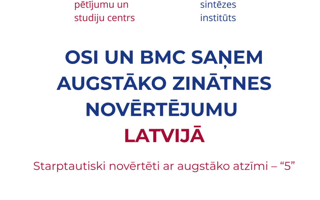 Starptautiskā ekspertu vērtējumā Latvijas Organiskās sintēzes institūts (OSI) un Latvijas Biomedicīnas pētījumu un studiju centrs (BMC) ir saņēmuši augstāko iespējamo novērtējumu – “5”, kļūstot par izcilāko zinātnes vienību Latvijā.
