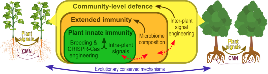 Pētniecības grupas ilgtermiņa mērķis ir izprast, kā labvēlīgie mikroorganismi ietekmē augu iekšējos un starpaugu signālus, kas iesaistīti augu aizsargreakcijās pret kaitēkļu un patogēnu uzbrukumiem. Jo īpaši, arbuskulārās mikorizas sēnes veido kopīgus micēlija tīklus (CMN), kas savieno augu saknes un spēj pārraidīt auga stresa signālus. Starpaugu signālu pārneses molekulāro mehānismu izzināšana paver iespējas uzlabot slimību izturību augu kopienas līmenī.